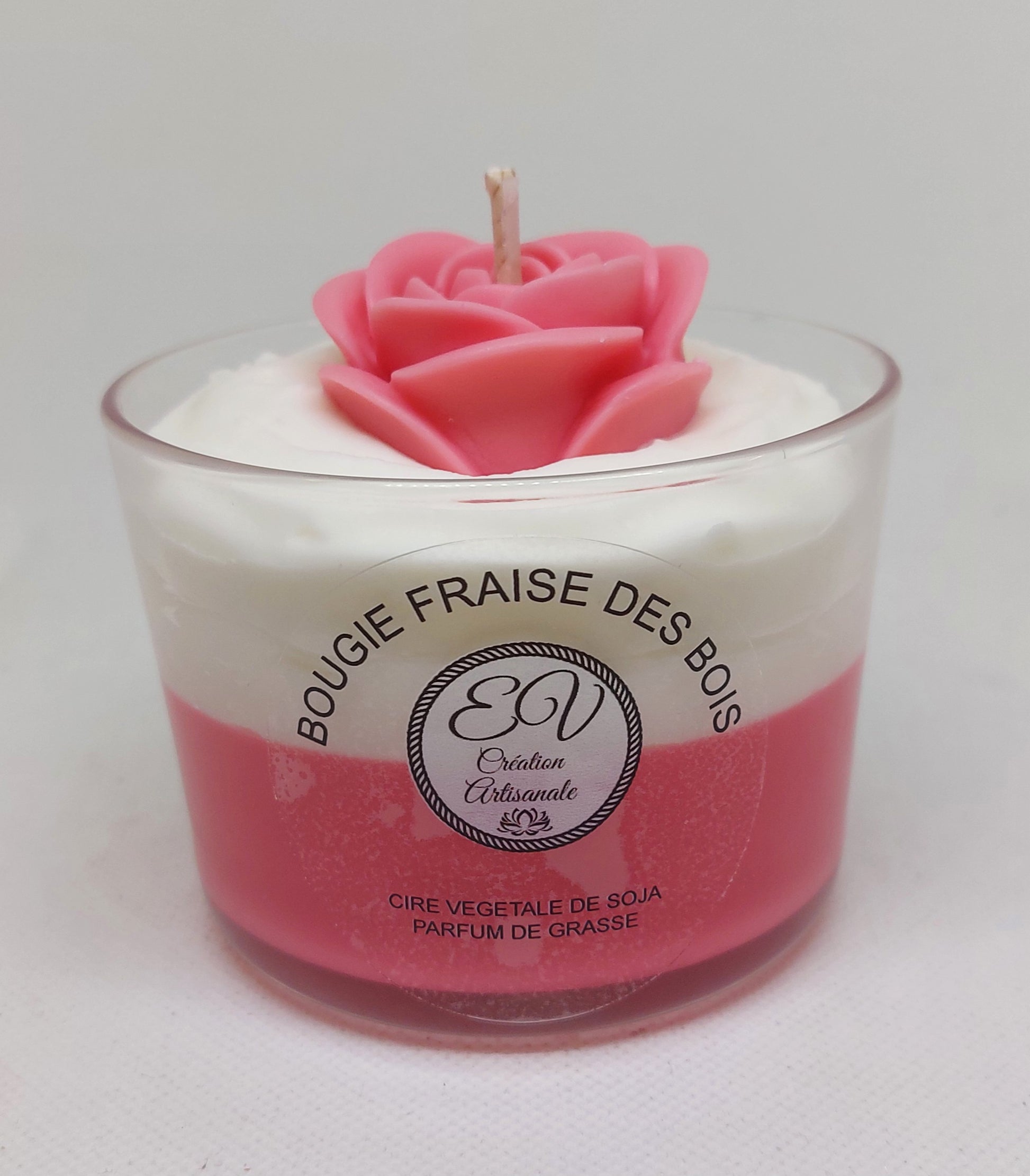 Bougie de cire végétale de soja et de parfum de grasse FRAISE de bois 185 g .entre 35h à 40h de combustion
