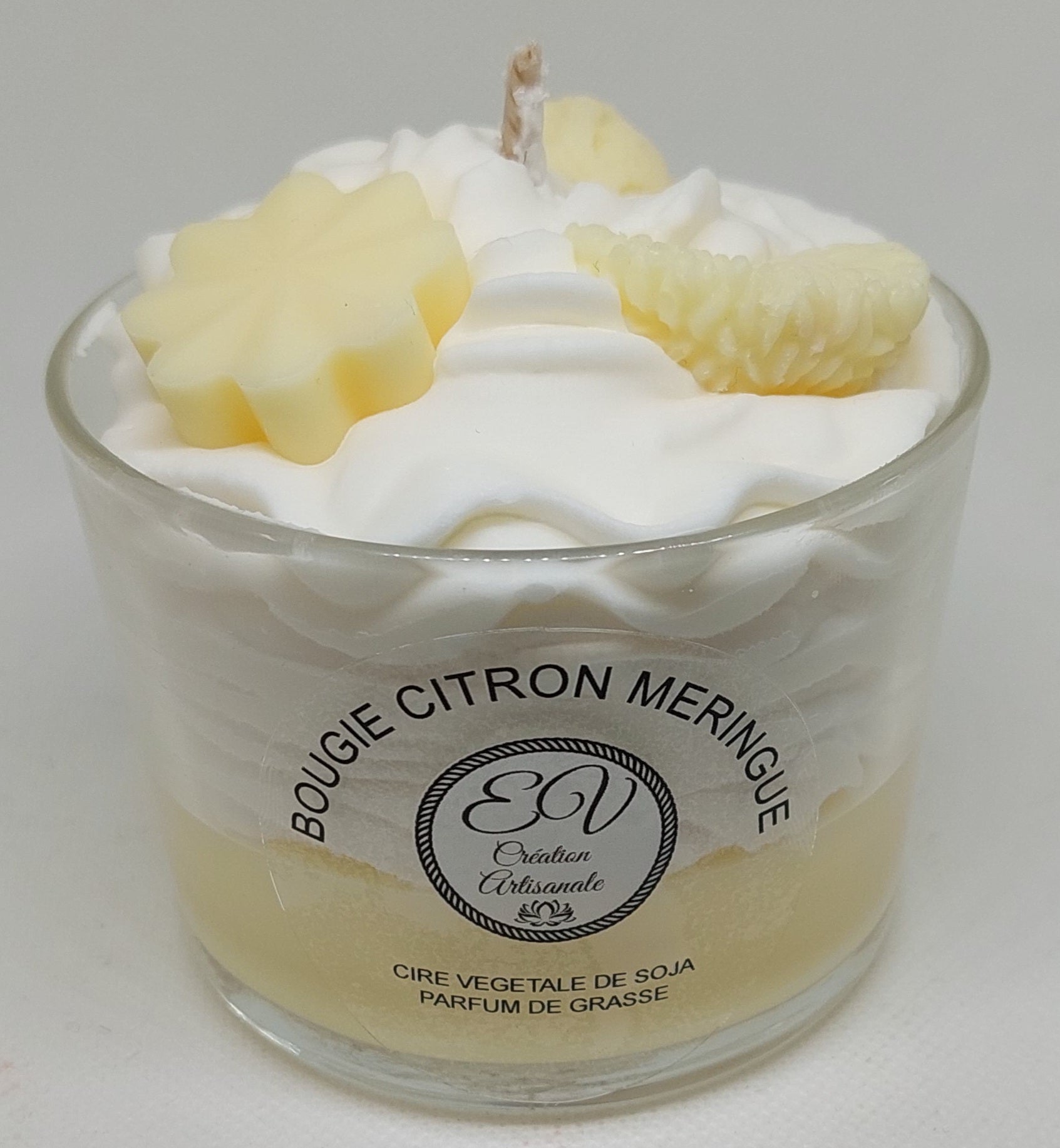 bougie cire végétale de soja et de parfum de grasse CITRON MERINGUE plus de 34h env de combustion 185g