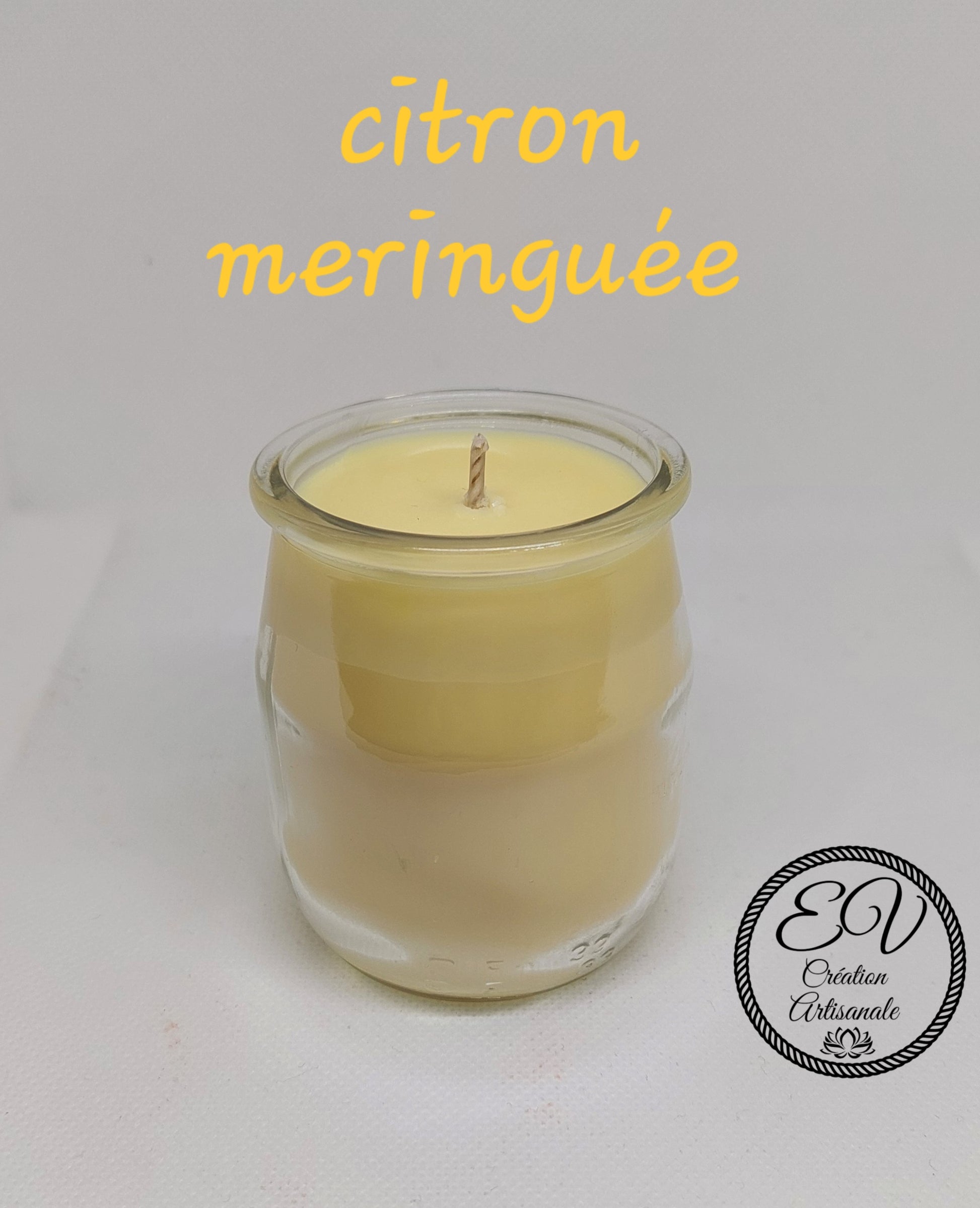 Bougie dans pot de yaourt à la cire végétale de soja et parfum de grasse CITRON MERINGUÉ plus de 24h env de combustion 110g